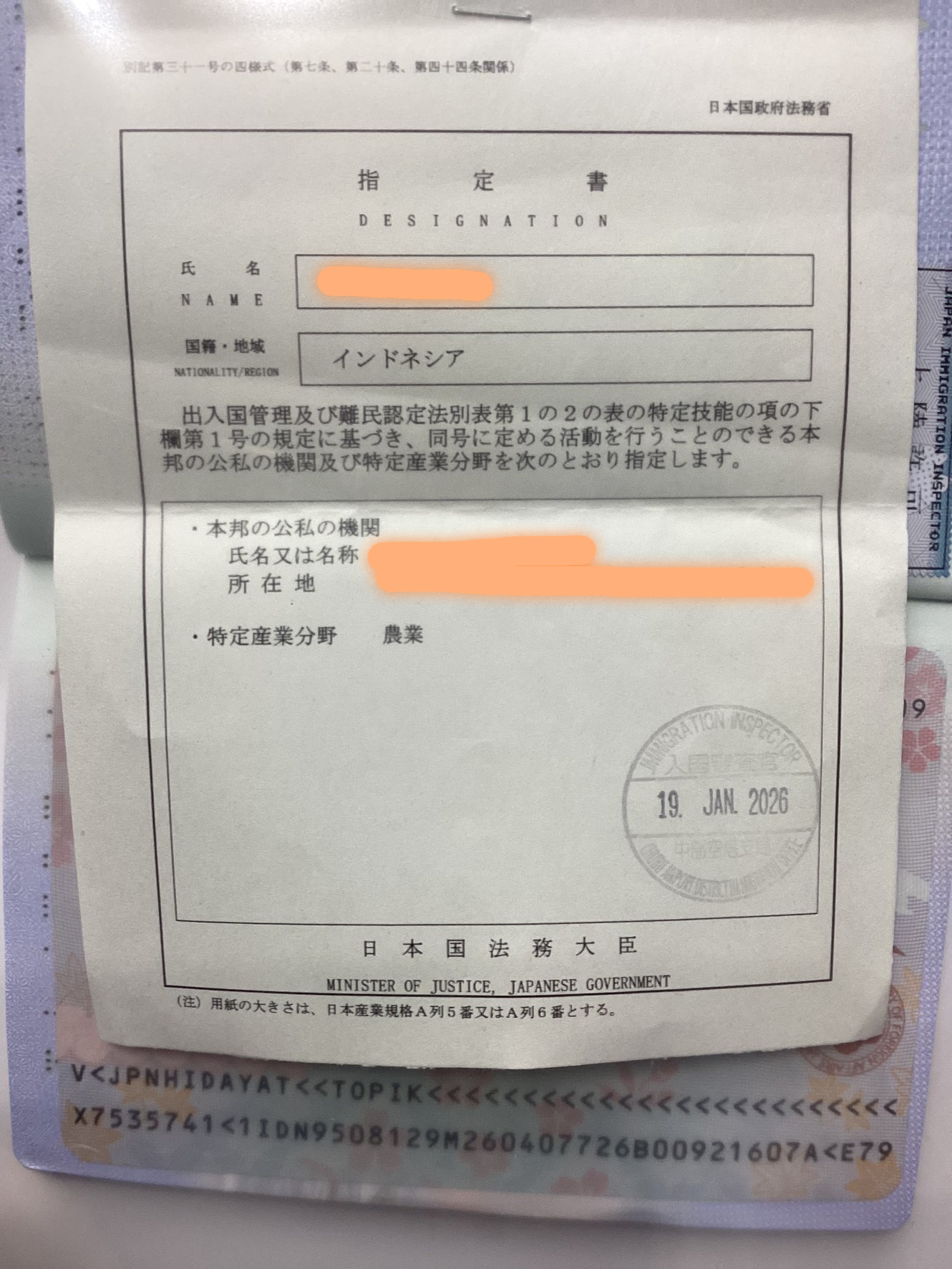 特定技能1号ビザ(農業)取得しました。